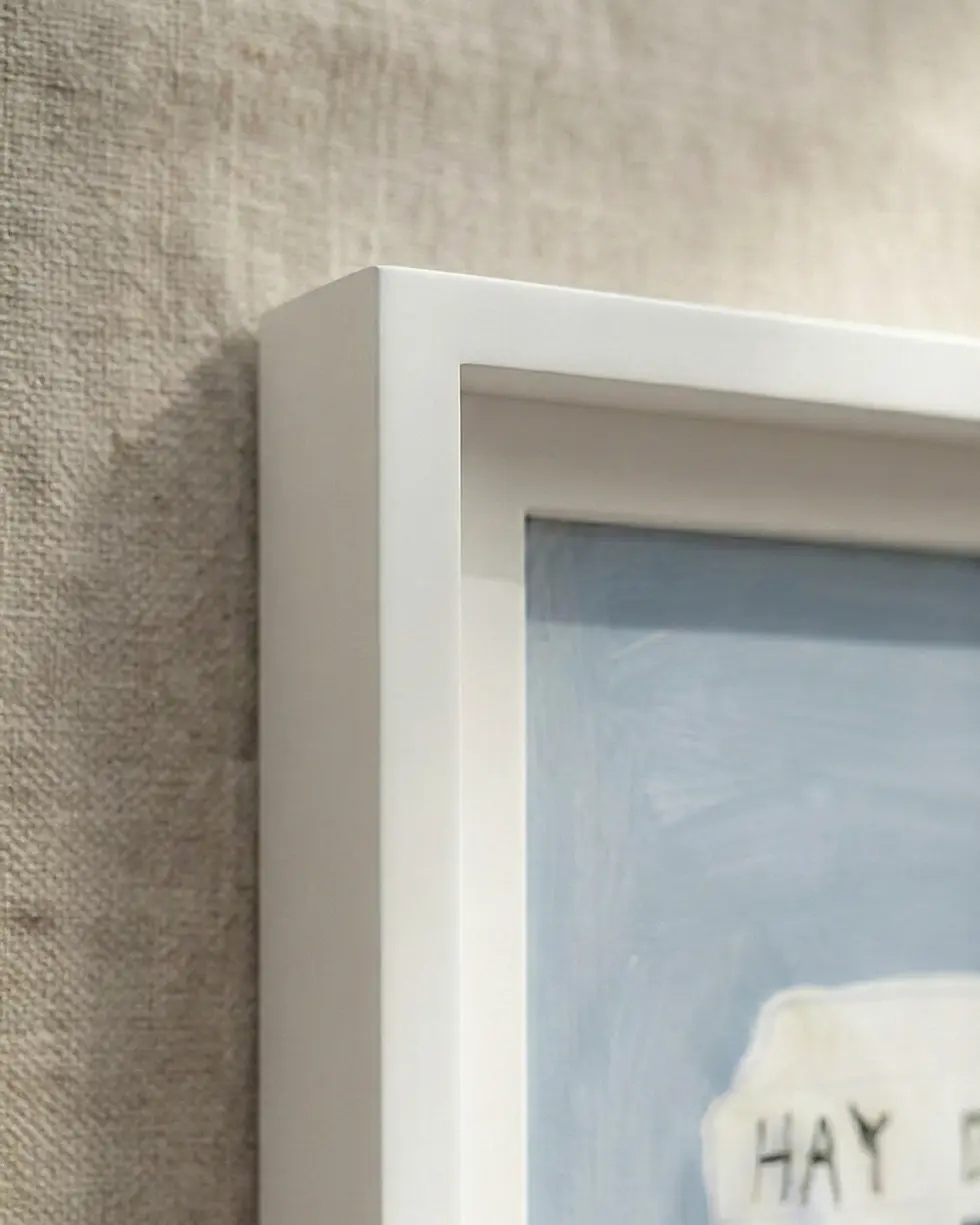 Elegimos una moldura blanca mate que se fusiona con la luz. Si hubiéramos usado madera natural o negro, habríamos "encerrado" el mensaje. Con el blanco, logramos que la luz rebote, creando una sensación de Daylight (luz de día) constante. El cuadro no pesa visualmente; flota.